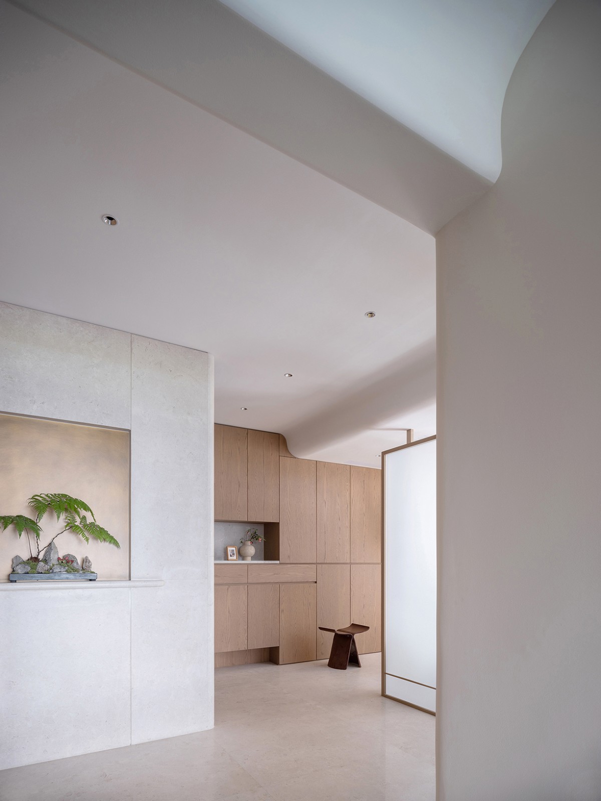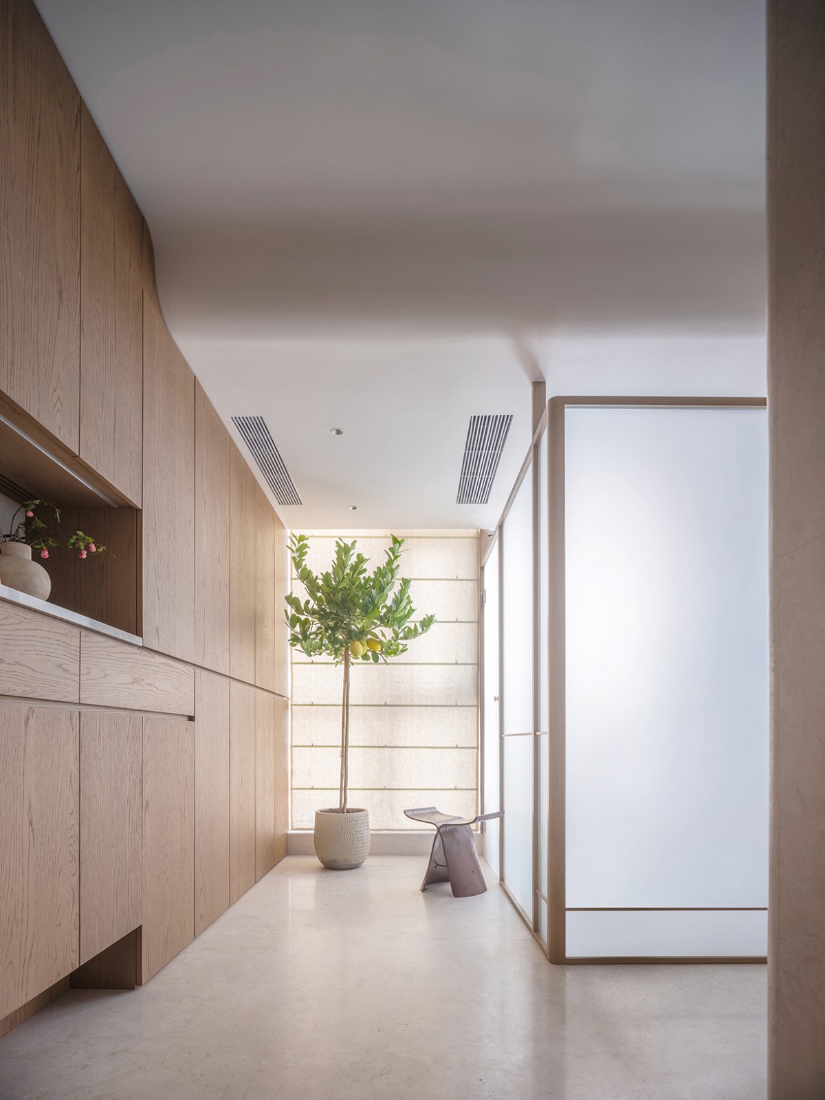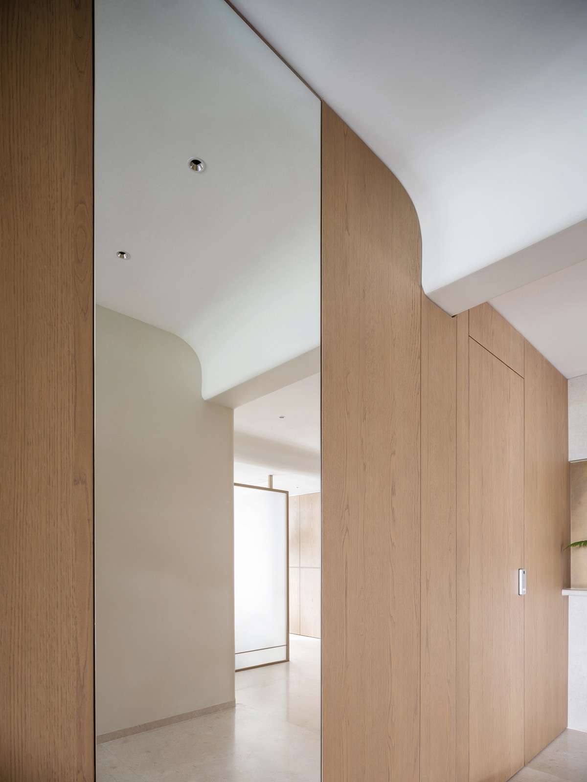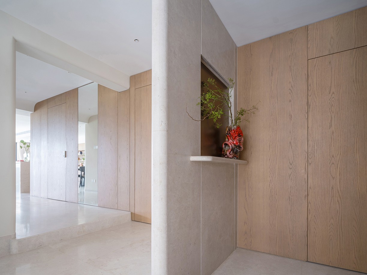 原先的入户闲置空间被改造成玄关,并增设了鞋帽空间,作为家的序章,赋予其更多的仪式感与实用性。室内大部分的门体采用了隐藏式设计,与墙面融为一体,既保持了空间的简洁与美感,又增强了私密性。