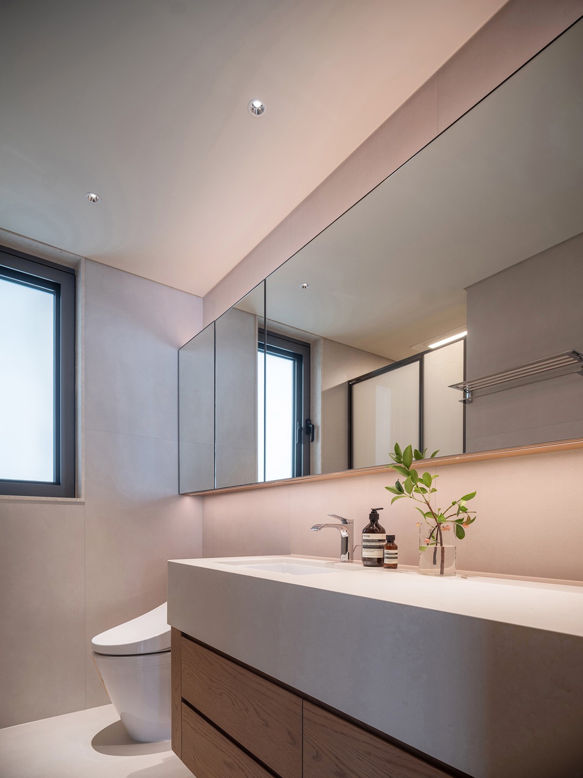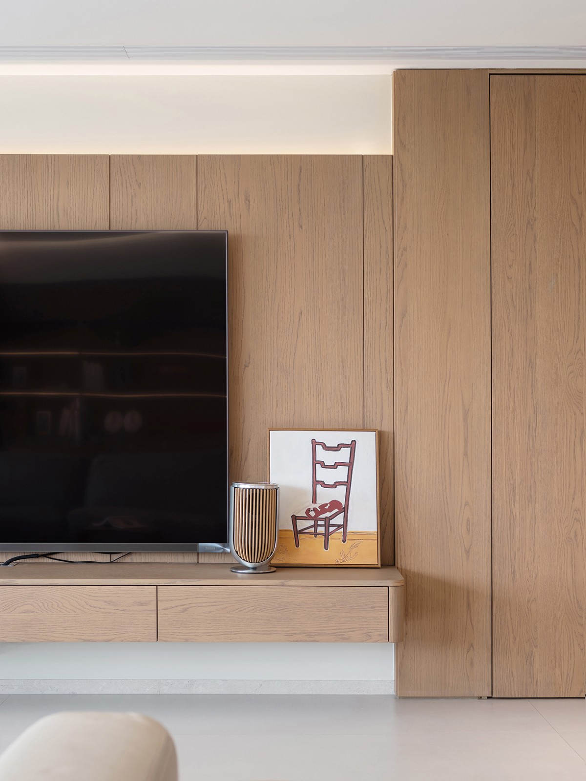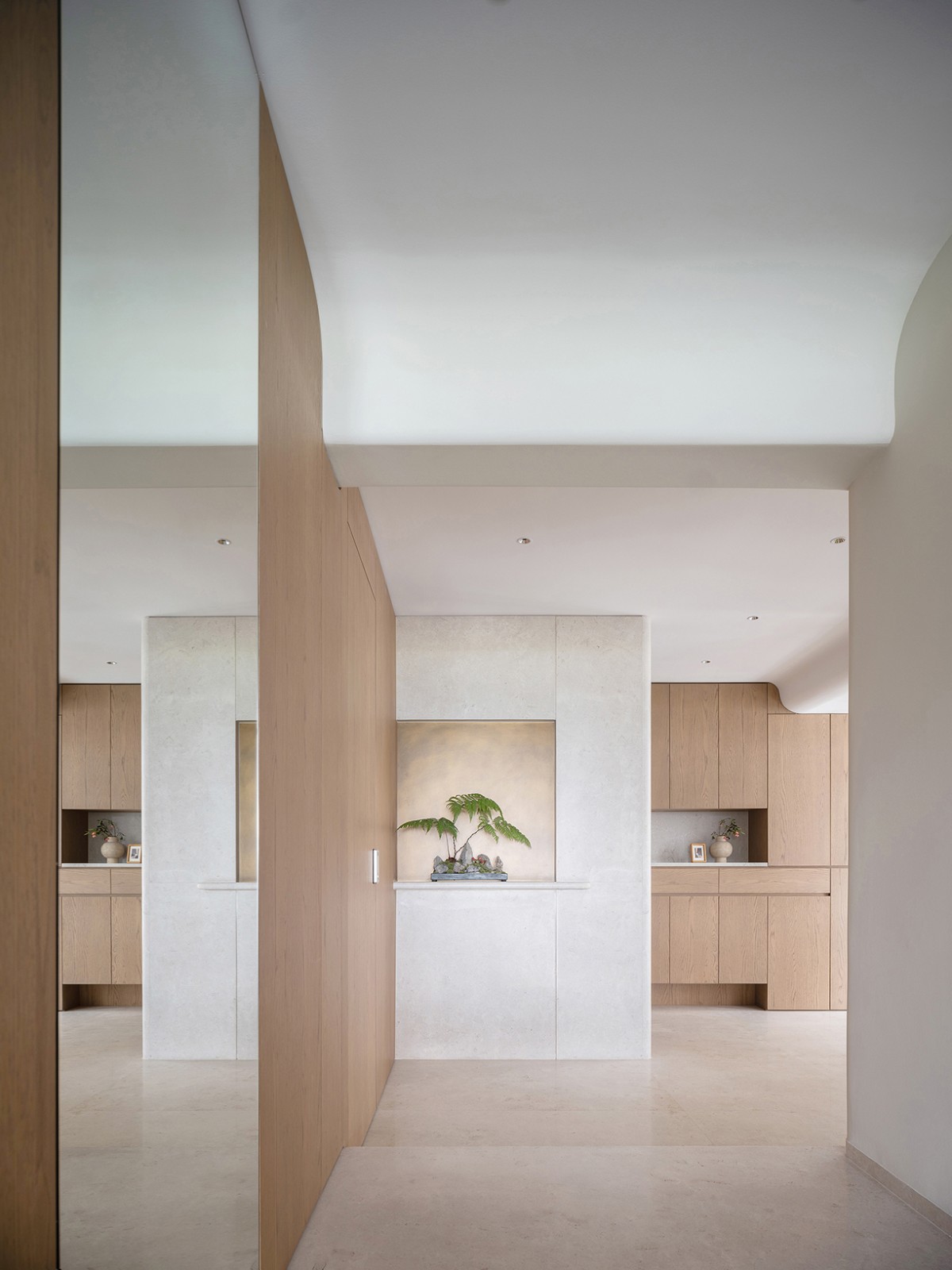 原先的入户闲置空间被改造成玄关,并增设了鞋帽空间,作为家的序章,赋予其更多的仪式感与实用性。室内大部分的门体采用了隐藏式设计,与墙面融为一体,既保持了空间的简洁与美感,又增强了私密性。