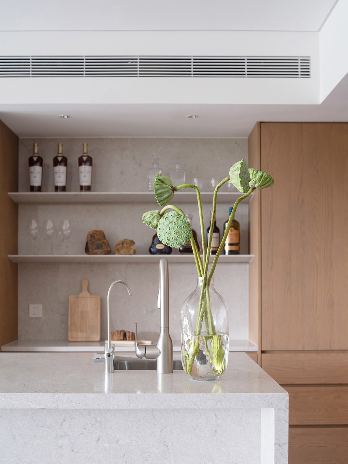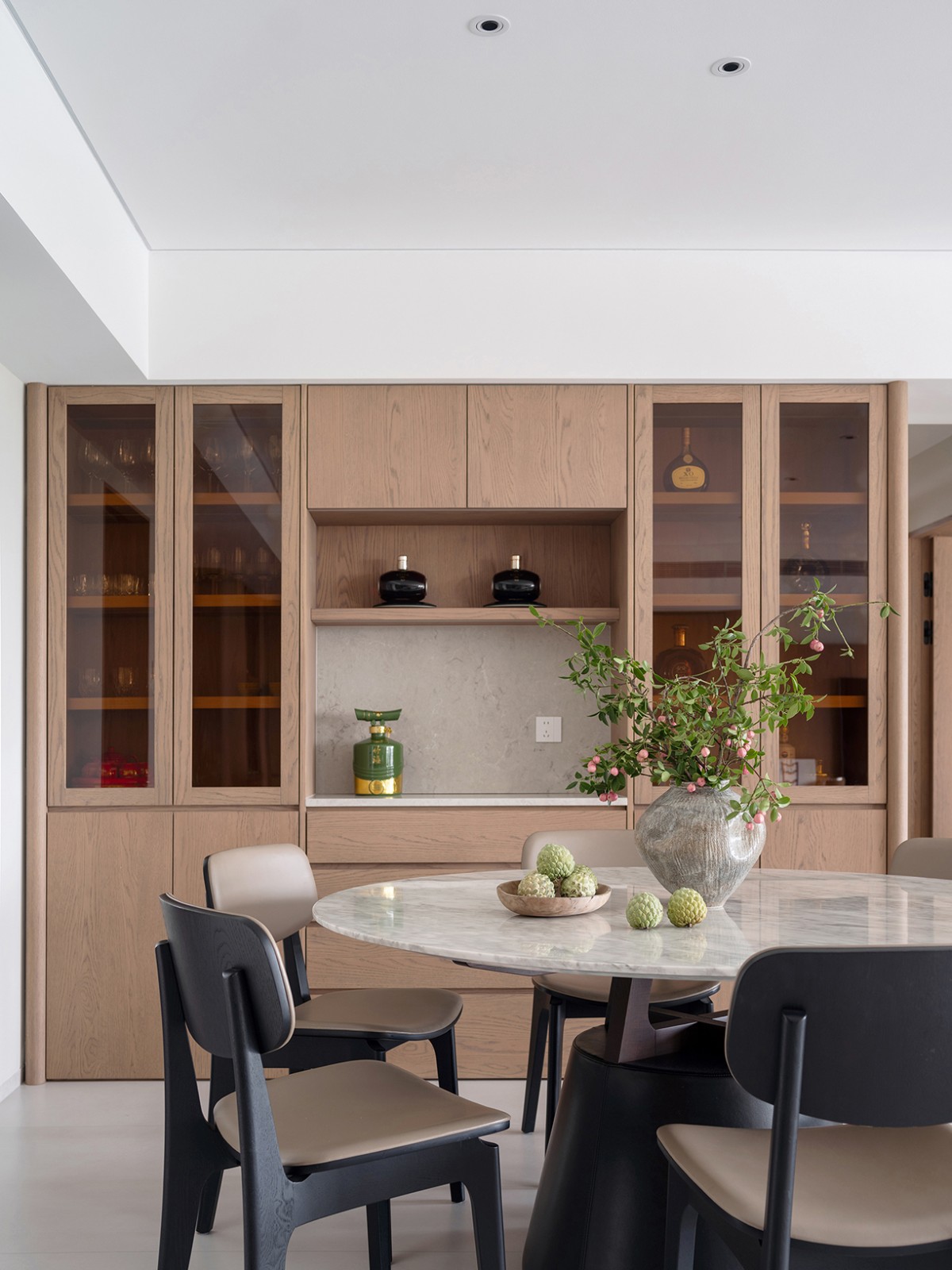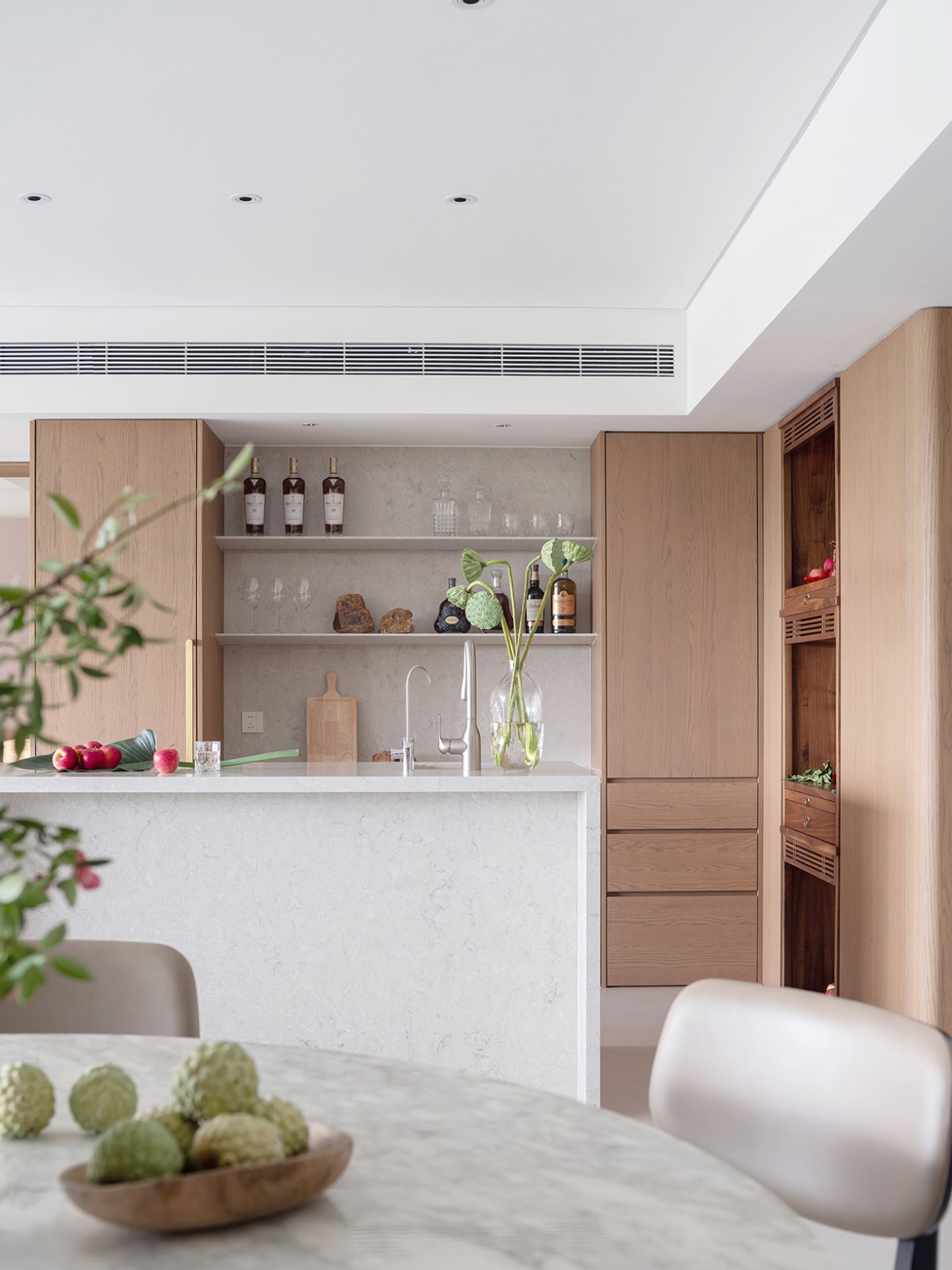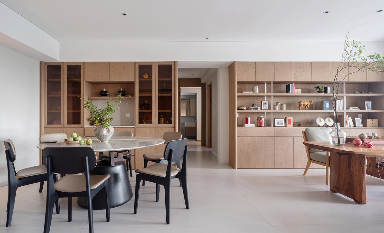 我们构筑的不仅是居所,更是一种生活方式,它映射了屋主一家人的生活日常。这里,东方的圆桌与茶台,西方的岛台和西厨,中西方文化元素在同一个空间中碰撞交融。