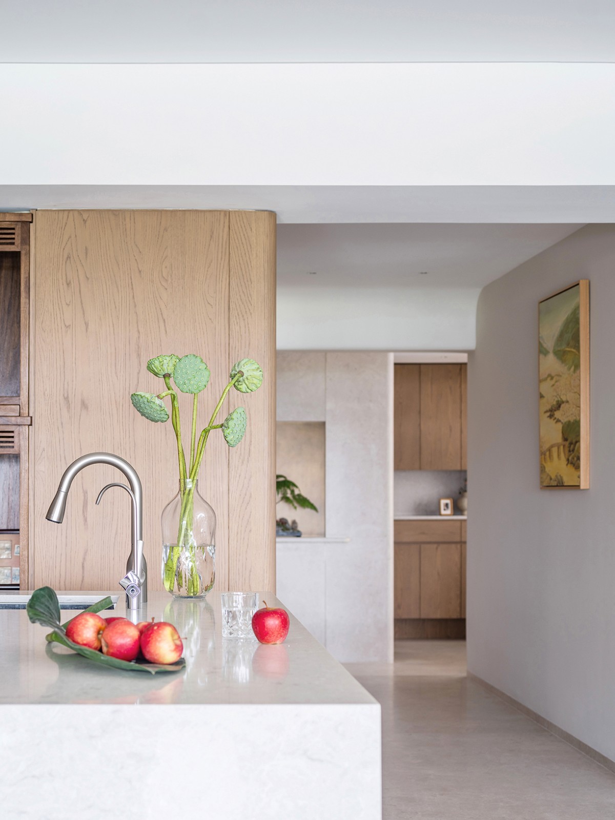 材质的选择,往往是对空间情绪与风格的直接呈现。屋主偏爱木质的自然质感,因而在材质选择上,我们选用了橡木,木质温润且沉稳,贯穿至每个空间,既保证空间的整体感,也为空间带来亲和力。搭配石头温润的柔光表面,人在触摸时能感受到不同材质所属的温度与细腻。