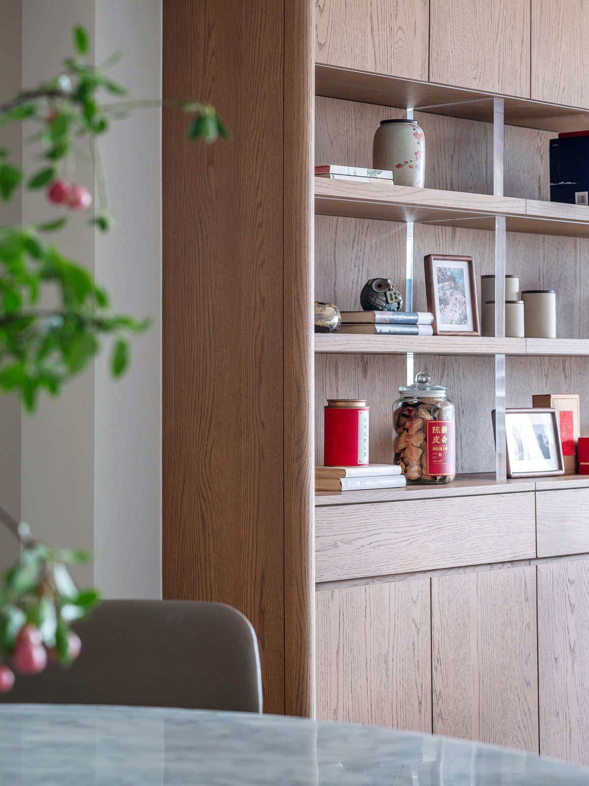 因屋主平日里有品茗喜好,我们在客厅一隅开辟出一方作为茶区。靠墙的展示柜陈列着各类茶叶和茶具,样式各异。屋主热爱摄影,柜上也常放着他拍摄的照片,记录生活中的美好瞬间。