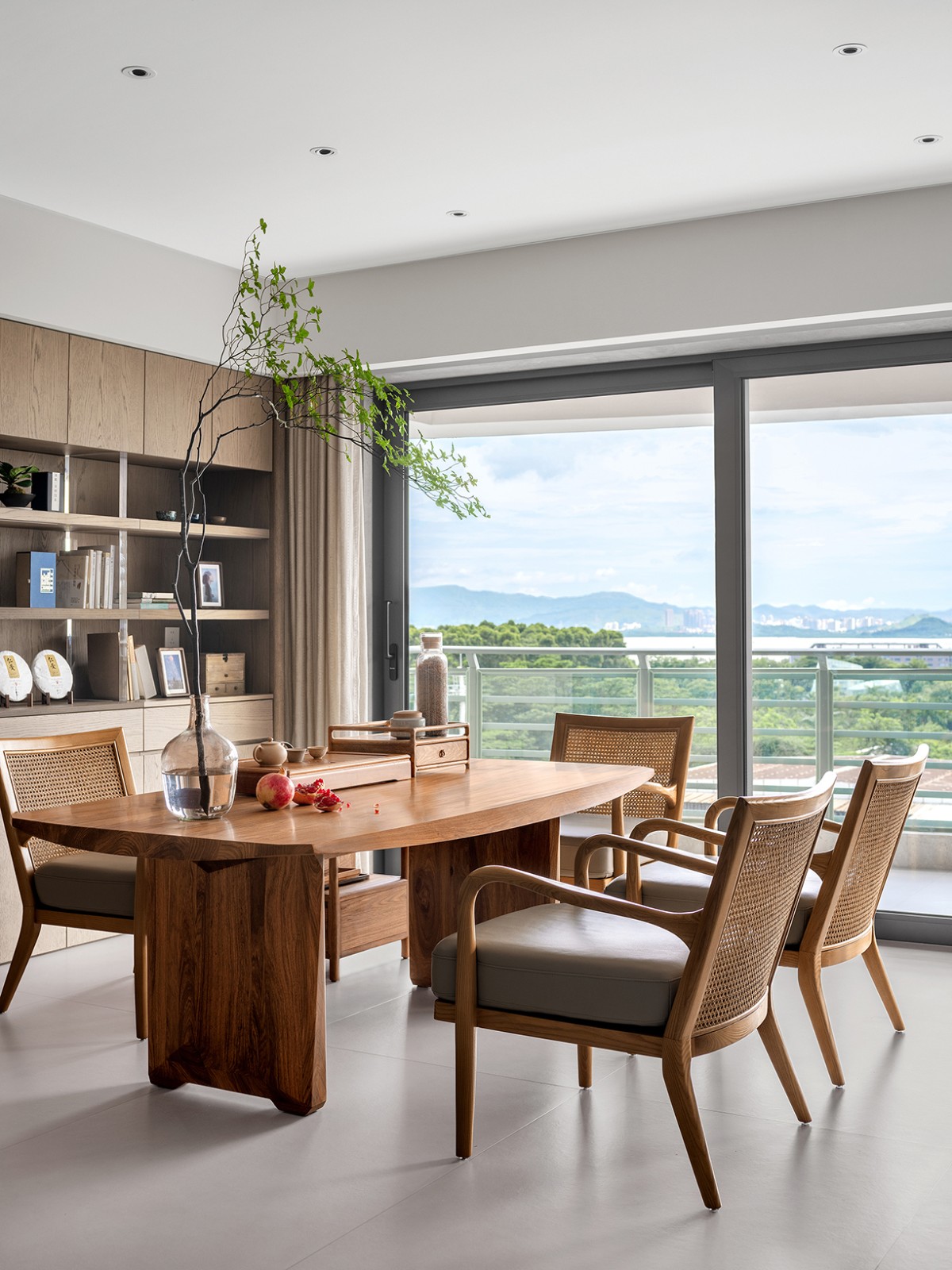 公共生活区在一个宽阔敞开的空间中,自然光线透过大落地窗倾泻而入,视野极为开阔,既能近观公园林景,也能远眺深圳湾海面与山峦。