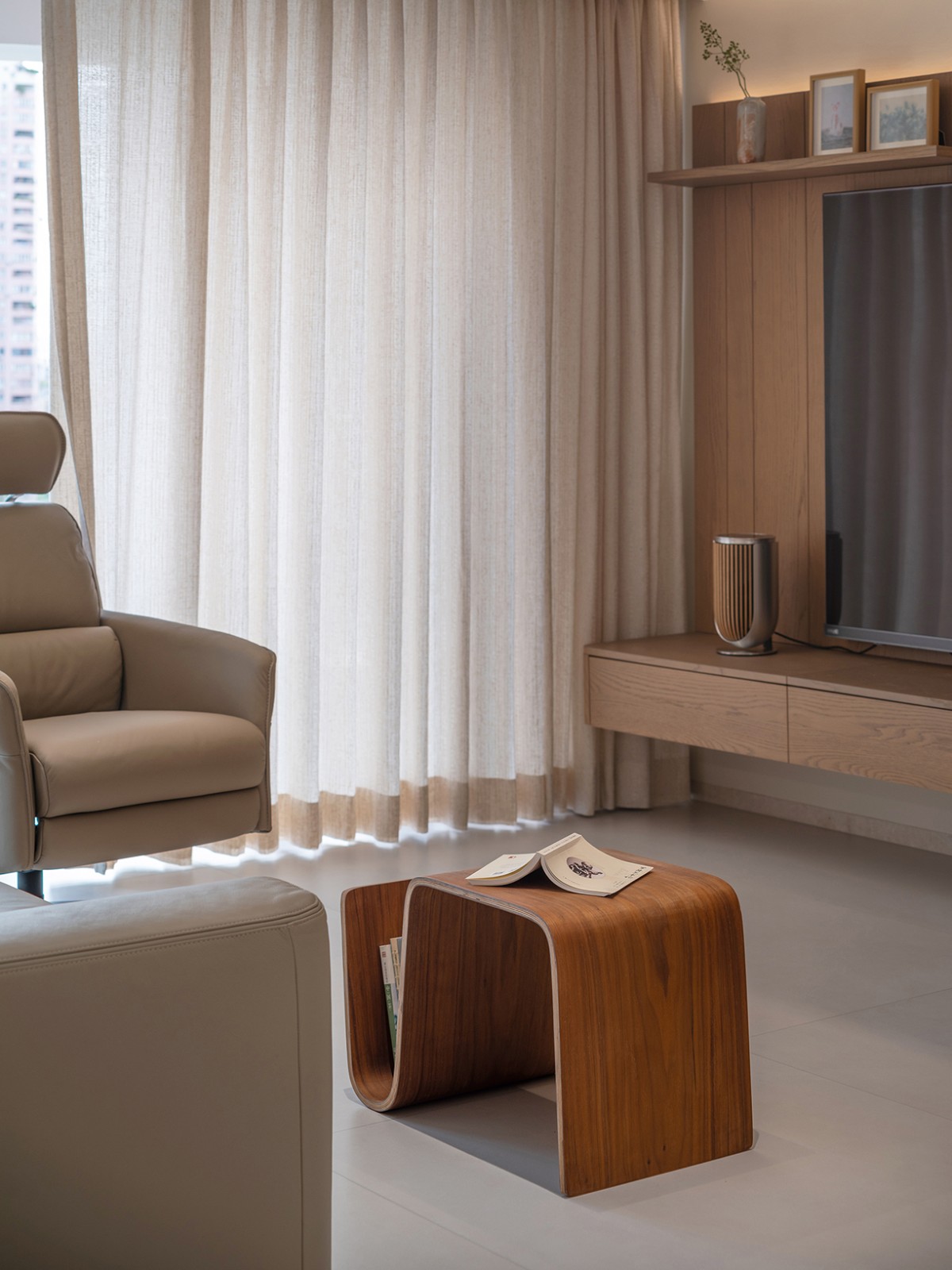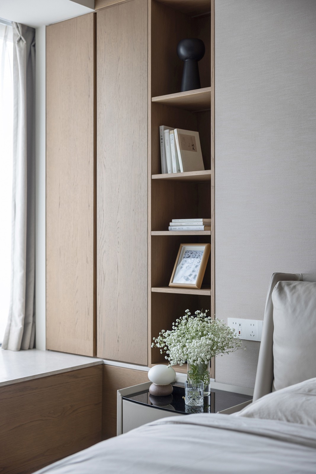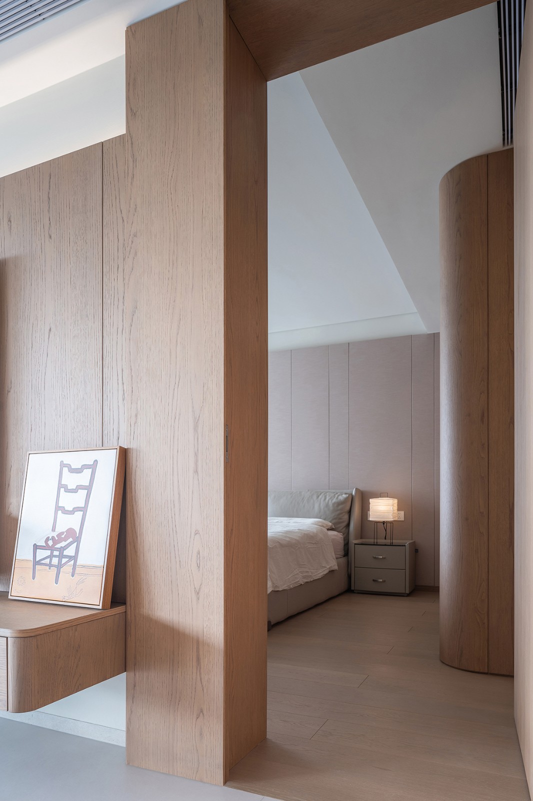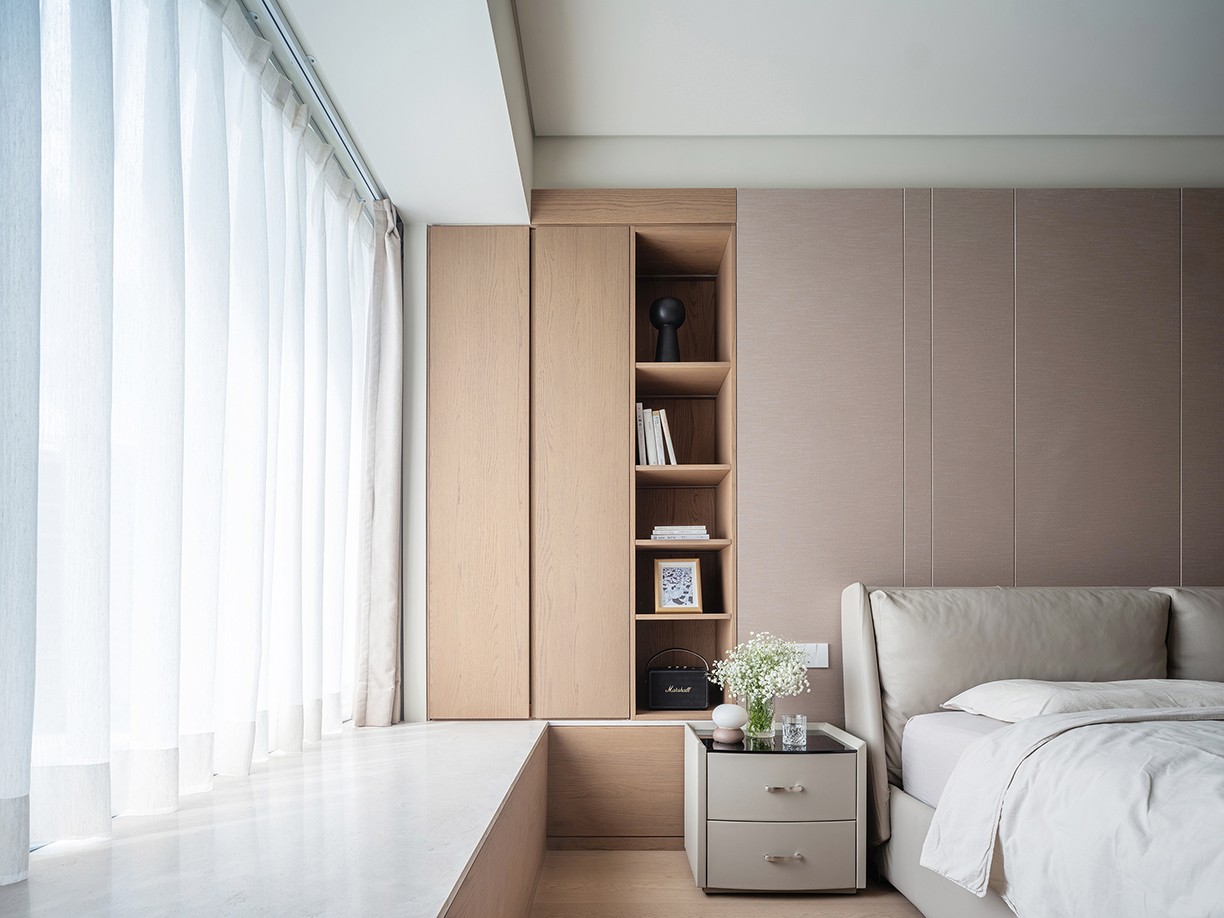 卧室之内,延续整体的简约基调。光线透过窗纱晕染开来,房间内更加温煦。大面积的原木材质,为空间营造出一种温暖的氛围,其温润的触感,仿佛建立起房间与身体之间的亲密联系,让人沉浸于自然的舒适之中。