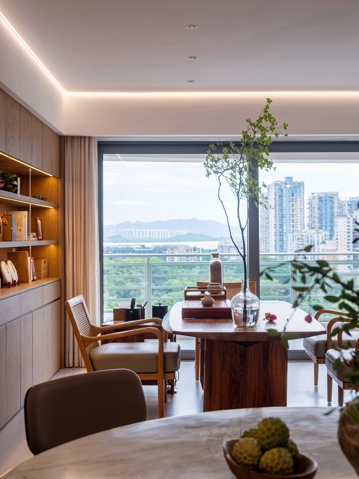公共生活区在一个宽阔敞开的空间中,自然光线透过大落地窗倾泻而入,视野极为开阔,既能近观公园林景,也能远眺深圳湾海面与山峦。