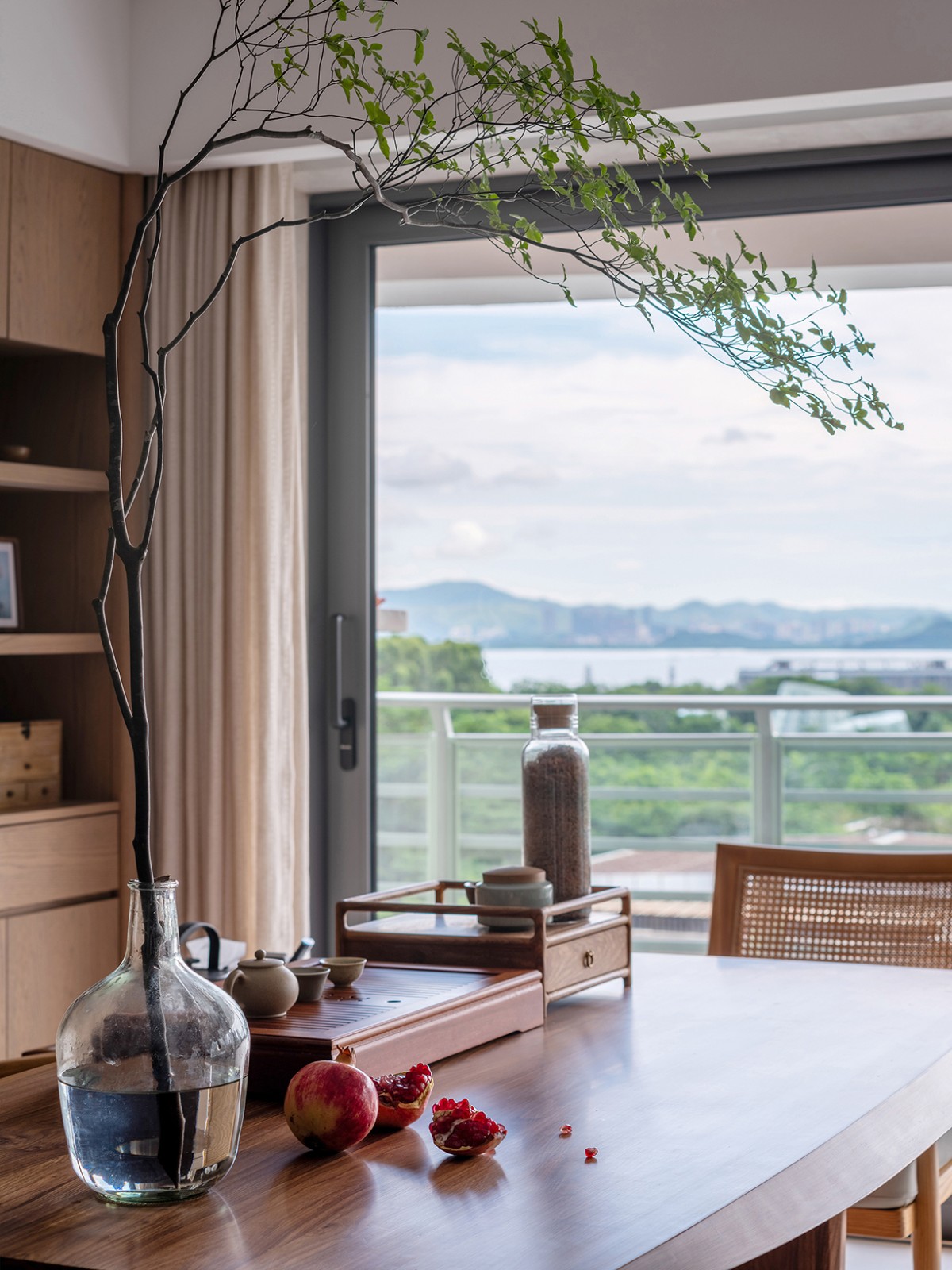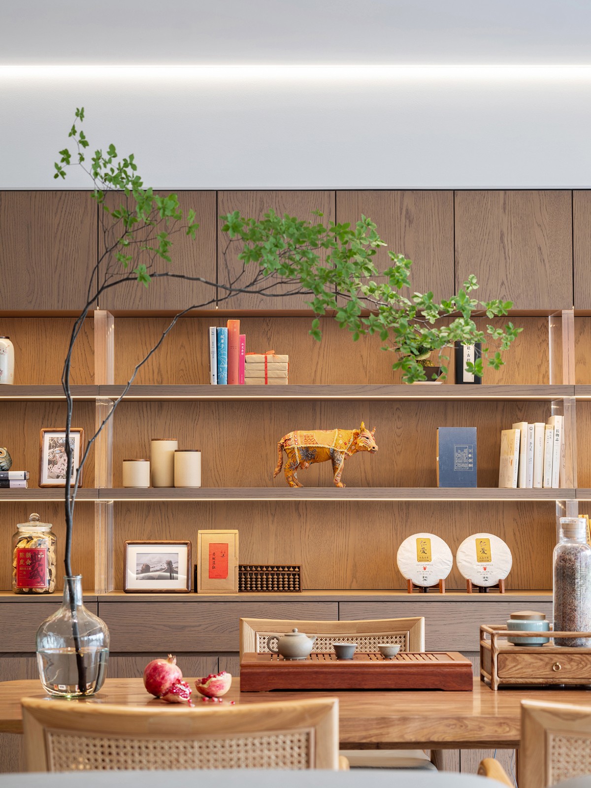 因屋主平日里有品茗喜好,我们在客厅一隅开辟出一方作为茶区。靠墙的展示柜陈列着各类茶叶和茶具,样式各异。屋主热爱摄影,柜上也常放着他拍摄的照片,记录生活中的美好瞬间。