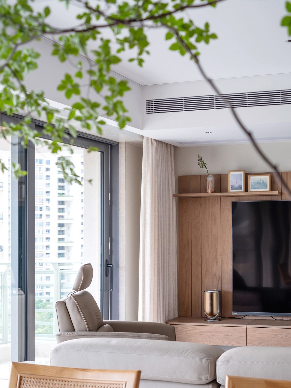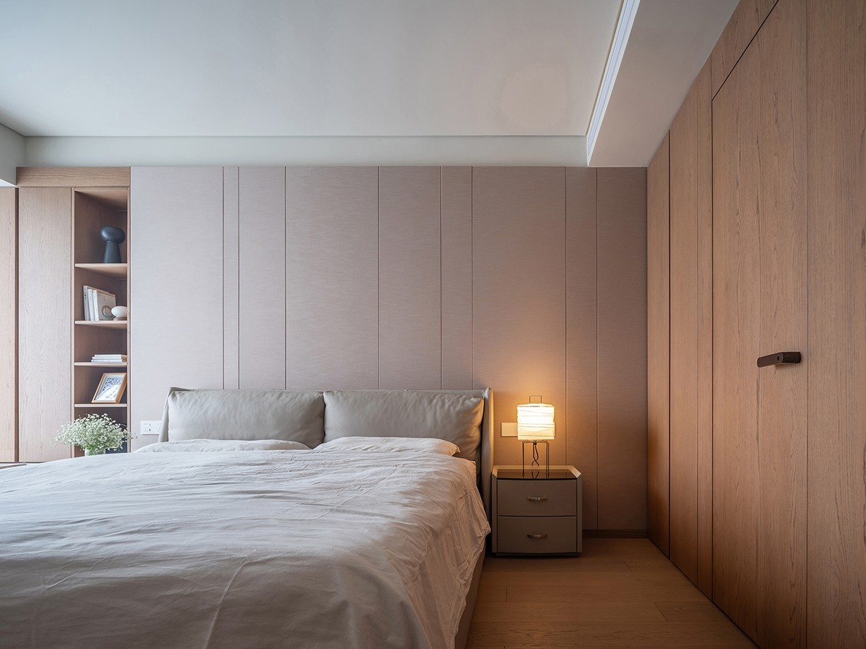 卧室之内,延续整体的简约基调。光线透过窗纱晕染开来,房间内更加温煦。大面积的原木材质,为空间营造出一种温暖的氛围,其温润的触感,仿佛建立起房间与身体之间的亲密联系,让人沉浸于自然的舒适之中。